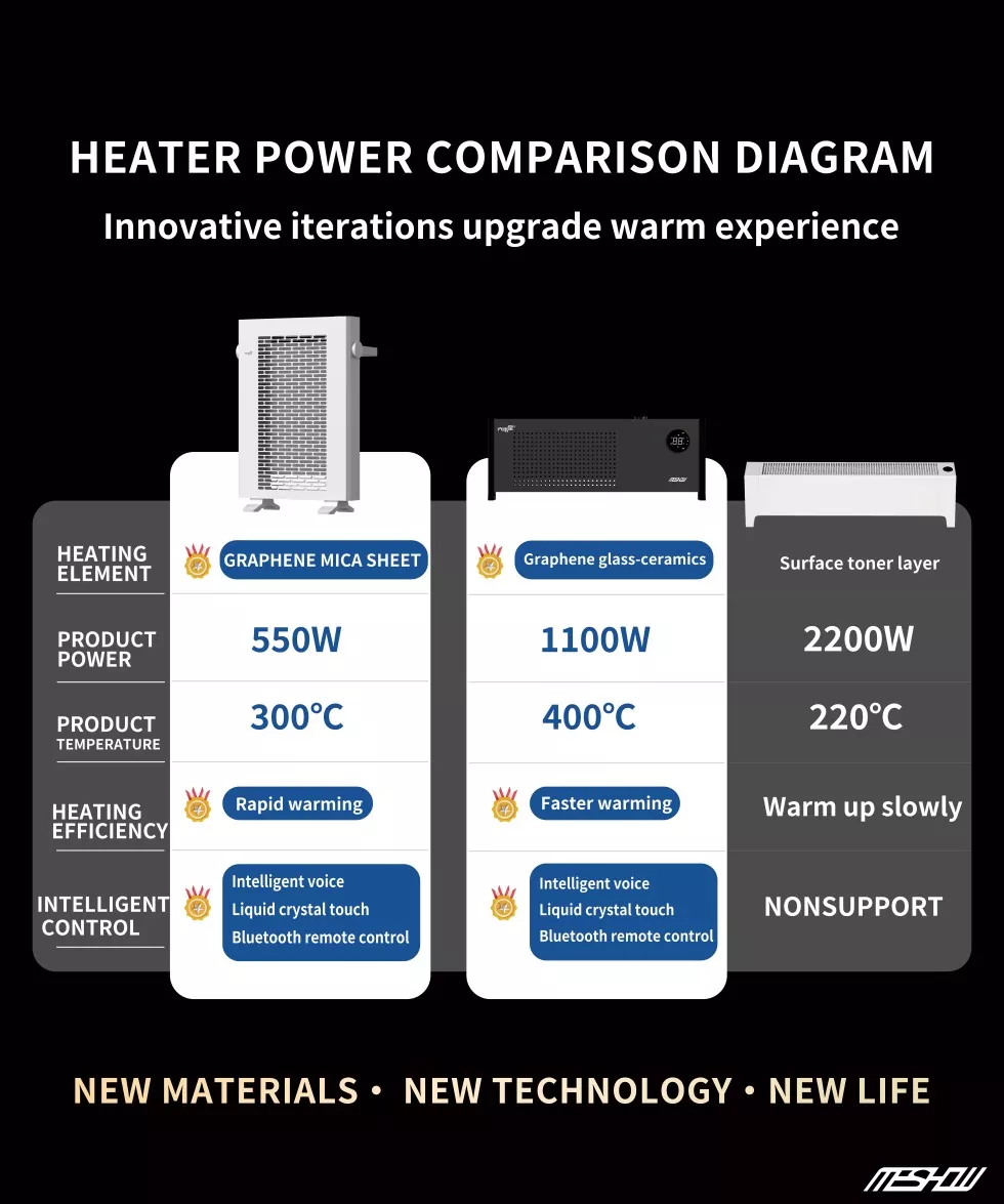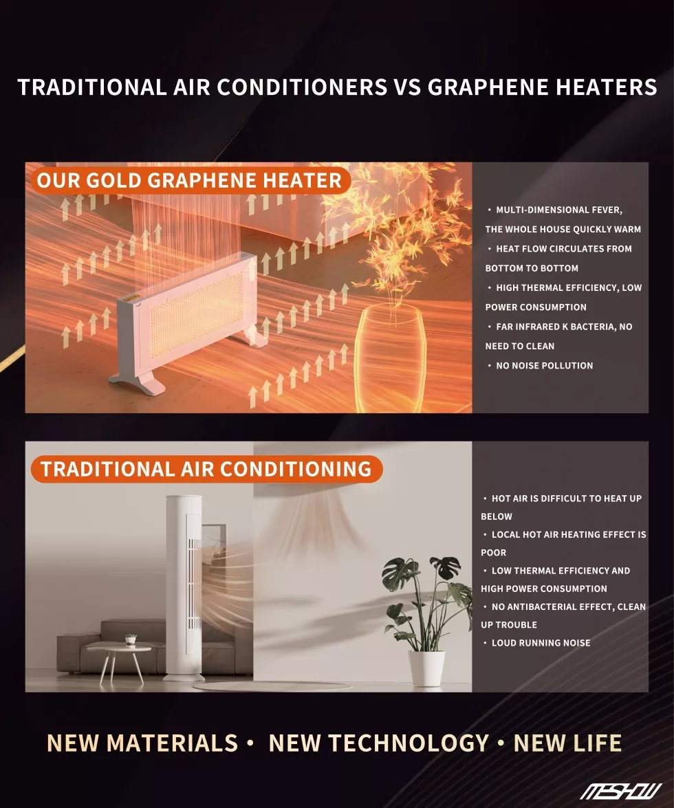 Meshow keskittyy korkealaatuisten mustan kannettavan kaukaisen infrapunagrapeenilämmittimien suunnitteluun ja tuotantoon. Käynnistä useita räätälöityjä tuotteita kansallisille markkinoille. Lämmittimet eivät ole vain energiaa säästävää ja ympäristöystävällisiä, vaan myös tyylikäs ulkonäkö ja erinomainen suorituskyky.